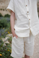 The neutral vanilla tone suits both boys' and girls' outfits – easy to pair with a tee, sweatshirt, or matching muslin shirt.