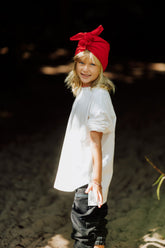 Turban is made of mid-weight organic cotton with addition of elastane for the maximum comfort of your baby. You can play with the frill in front and shape it as you please. In case you need to change the depth of your turban untie the bow in the back and tie it again, lighter or harder. Suitable for all seasons. GOTS (Global Organic Textile Standard) and OEKO-Tex certified.