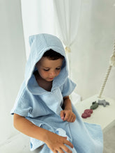 Children's bath poncho made from soft muslin 100% GOTS-certified organic cotton. It’s the perfect choice for the beach, pool, or summer strolls.