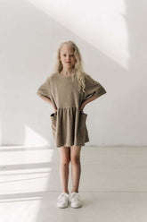 Crafted with care for our children, our dress in a beautiful beige color brings together cozy comfort and playful elegance. Made from cotton terry fabric in a beautiful shade of beige. A boxy shape, charming design, and two front patch pockets. This dress is perfect for spring outfits and long summer adventures. Its versatile cut makes it easy to style for any occasion.